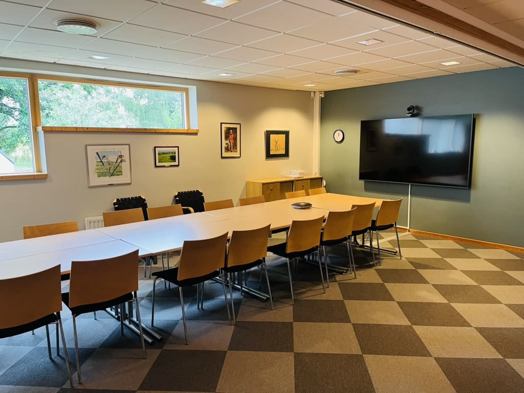 Konferenslokalen finns i klubbhusets nedre plan, i direkt anslutning till restaurangen, och det finns plats för ca 30-50 personer beroende på aktivitet. I konferenslokalen finns både fast projektor och duk (t.h), 85″ bildskärm, whiteboardtavla, papper, pennor, öppet WIFI (LAGK Guest), etc. Strax intill konferenslokalen finns möjlighet till golf i vår inomhushall.