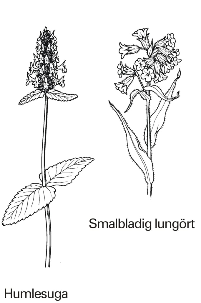 Stigen vänder nu ner mot klubbhuset. Längs leden finns en raritet, humlesugan (Betonica officinalis). Den blommar i mitten av sommaren och har förr använts som medicinalväxt. Kungsmarken är en av dess få kvarvarande växtplatser i Sverige. I den örtrika slänten mot bäcken blommar redan i april – maj en annan verklig raritet, smalbladig lungört (Pulmonária angustifólia). Detta är dess enda växtplats i Skåne. Från att tidigare varit ett ganska omfattande bestånd har den tyvärr reducerats under senare årtionden.